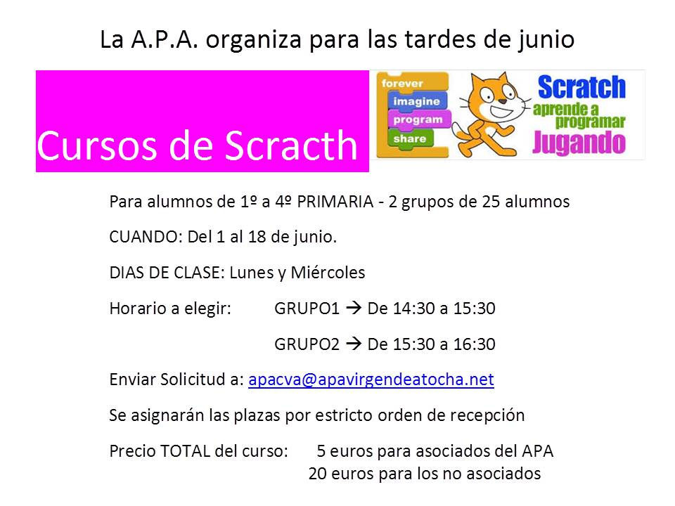 Cursos de Scratchapavirgendeatocha19 jun 20151 Min. de lecturaDurante las tardes del 1 al 18 de JUNIO se realizaron cursos de Scratch para los alumnos de 1º a 4º de Primaria
